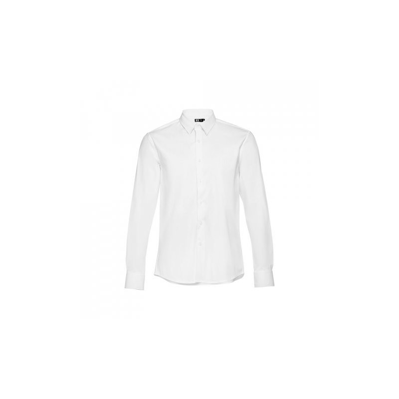 Camisa de popelina de manga larga unisex compuesta por 68% algodón, 28% poliamida y 4% elastano (115 g/m²). La manga incluye 1 pliegue y puños ajustables con 2 botones y la tapeta lleva 7 botones a juego con el color de la camisa.