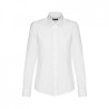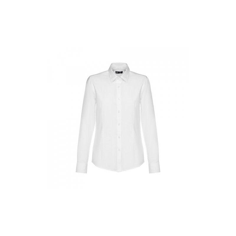 Camisa oxford de manga larga para mujer compuesta por 70% algodón y 30% poliéster (130 g/m²). La manga incluye 1 pliegue y puños ajustables con 2 botones. Es entallada, con 2 pinzas en la parte delantera y trasera y la tapeta contiene 7 botones color perla.