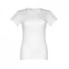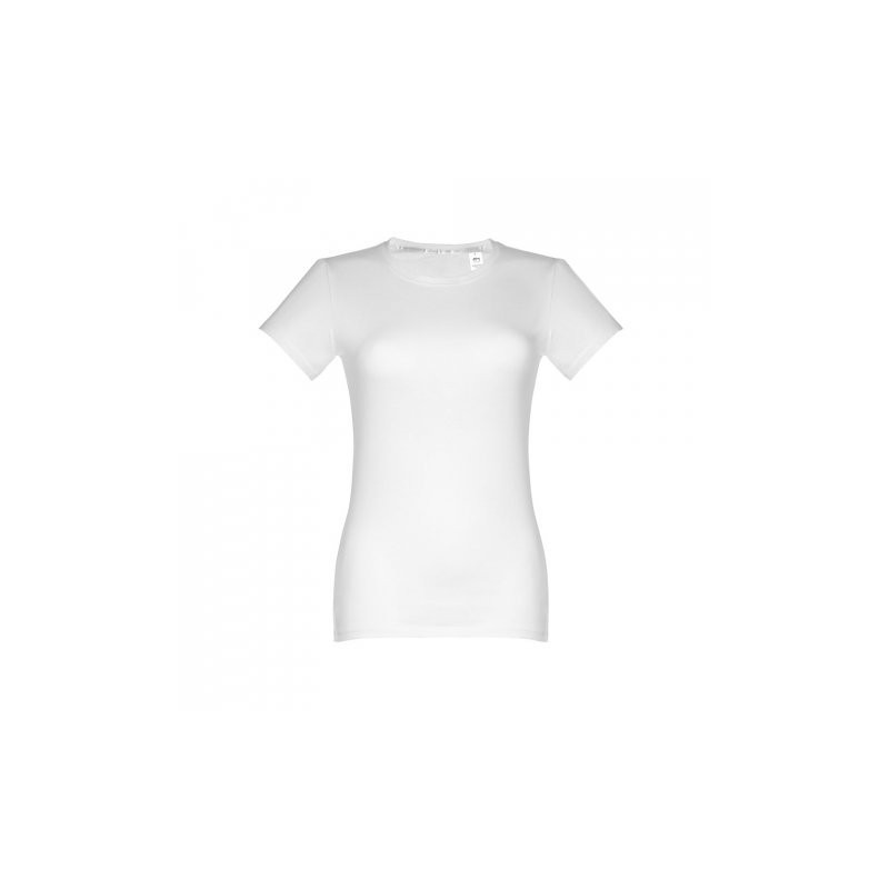 Camiseta de mujer entallada en punto jersey de algodón 100% (190 g/m²) con hilo de algodón cardado. Tiene el cuello de jersey fino con cinta de refuerzo de raso. Pieza cortada y cosida con doble costura en mangas y bajo.