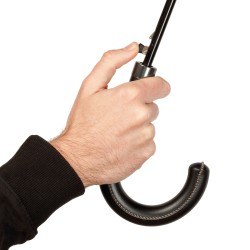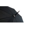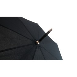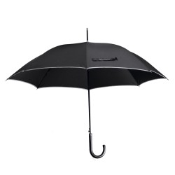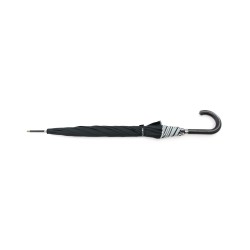 Paraguas de Antonio Miró de 8 paneles, con elegante diseño en color negro con ribetes en color blanco. De 100cm de diámetro, con apertura automática y en resistente material pongee. Con varillas metálicas en color negro, cierre de velcro y mango de suave tacto en polipiel. Presentado en funda con logotipo de la marca y cinta con accesorio de ajuste.