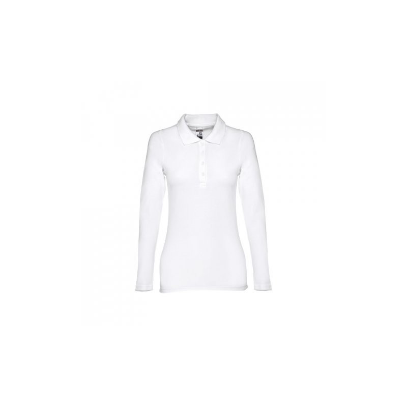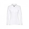 Polo de mujer de manga larga en piqué de algodón 100% (210 g/m²). Cuello acanalado reforzado con cinta de piqué. Tiene la tapeta reforzada con 4 botones a juego con el color del polo (botón de repuesto insertado en la costura interior). Pieza cortada y cosida con mangas de doble costura.