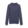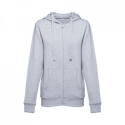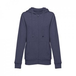 Sudadera para mujer compuesta por 50% algodón y 50% poliéster (320 g/m²) con interior cardado. La capucha está forrada y tiene un cierre con cordón a juego con el color de la sudadera. En la zona frontal hay dos bolsillos "marsupiales" y cierre con cremallera. Los puños y cinturilla están rematados con canalé.
