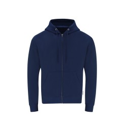 Sudadera Unisex con capucha y cremallera de Algodón Orgánico y Poliéster Reciclado, en suave felpa perchada de 280 g/m2. Con capucha forrada de doble capa, cordones redondos ajustables -con topes a juego- y ojales metálicos. Puños y cintura de punto canalé de elastano y bolsillo frontal tipo canguro. Apertura de cremallera oculta metálica, con cubrecosturas reforzado en cuello. Incluye etiqueta distintiva eco.